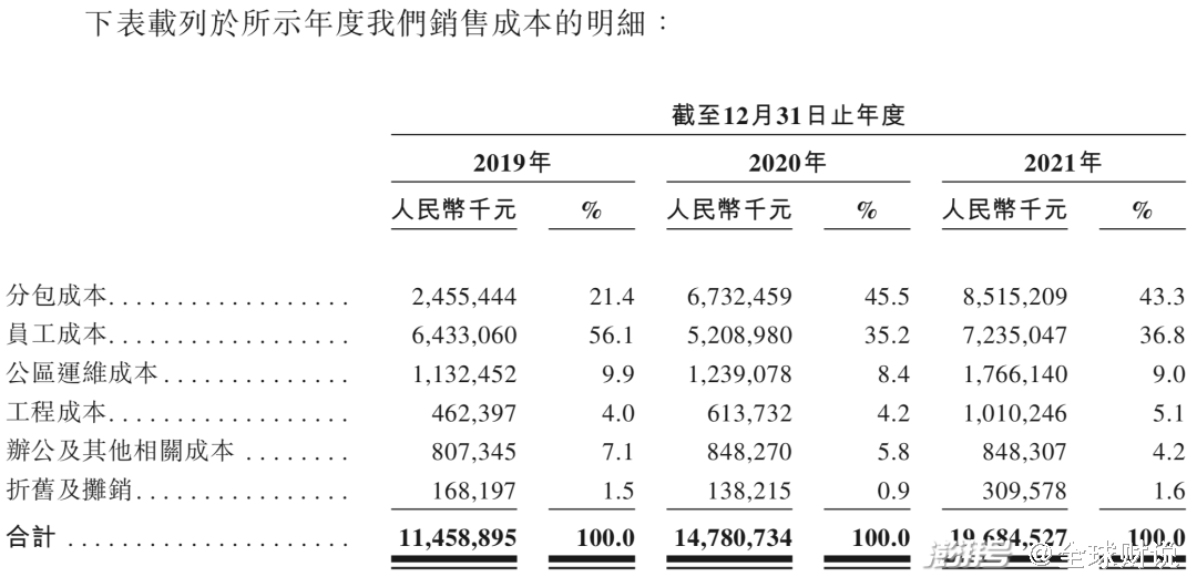 2019年-2021年,万物云员工成本与分包成本合计占销售成本比例为77.5%、80.7%、80.1%,人工成本并未出现显著减少。