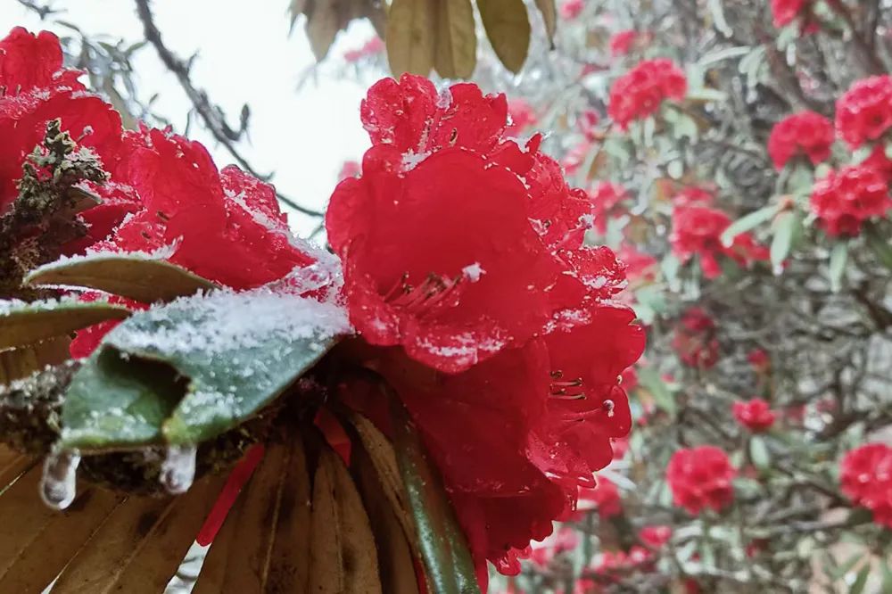 昆明禄劝县、东川区等地普降小到中雨,高海拔地区降小雪或雨夹雪,部分地区出现雨凇等天气现象。恰逢火红的高山杜鹃花开,大地呈现冰火两重天。