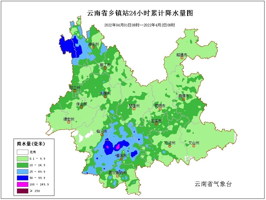 4月4日:迪庆、怒江多云间阴有小到中雨,德宏、保山、临沧、大理、丽江、昭通多云有阵雨局部中雨,其他地区晴。