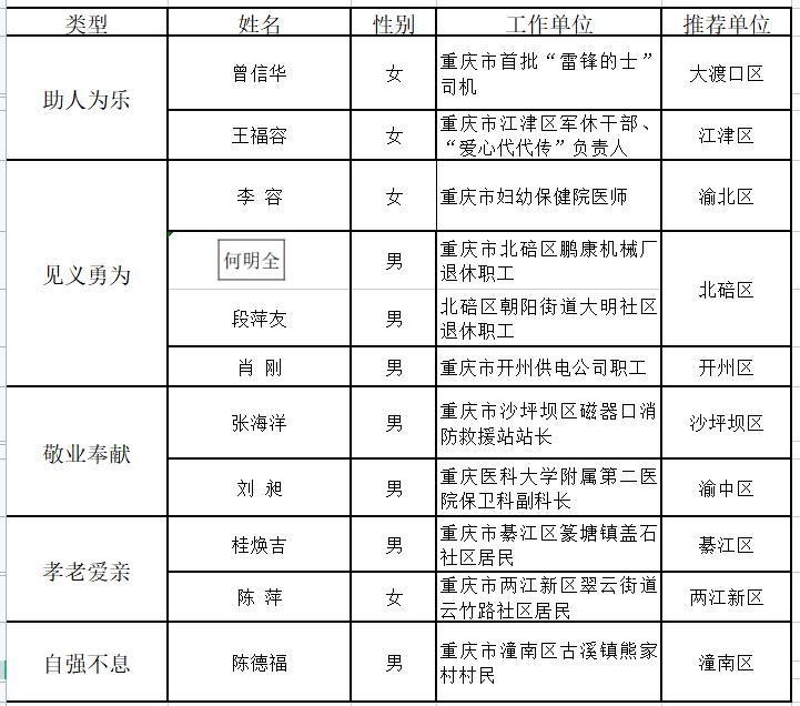 重庆市首批“雷锋的士”司机曾信华,连续2年,风雨无阻接送出行不便的重病老人,定期前往医院就医,直到老人去世;主动为贫困留守女童提供物质帮助,并签署器官捐献协议;疫情期间,率先免费接送一线医护人员及其家属。