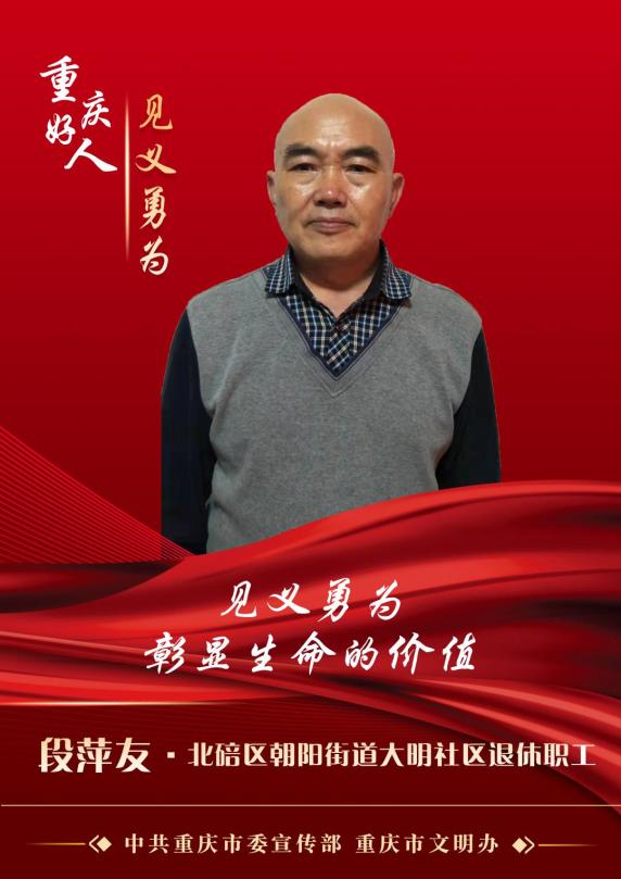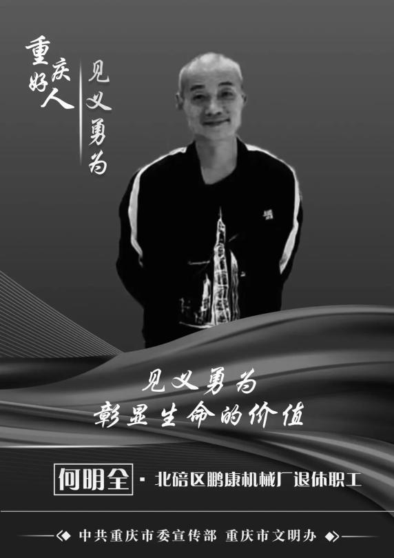 重庆市北碚区鹏康机械厂退休职工何明全、北碚区朝阳街道大明社区退休职工段萍友,在北碚区朝阳街道正码头嘉陵江附近发现有人溺水,在救生设备和器材缺乏、水性不佳的情况下,他们毅然下水救人,经过艰难的接力救援,最终溺水者获救,而何明全在施救过程中不幸溺亡,献出了生命。