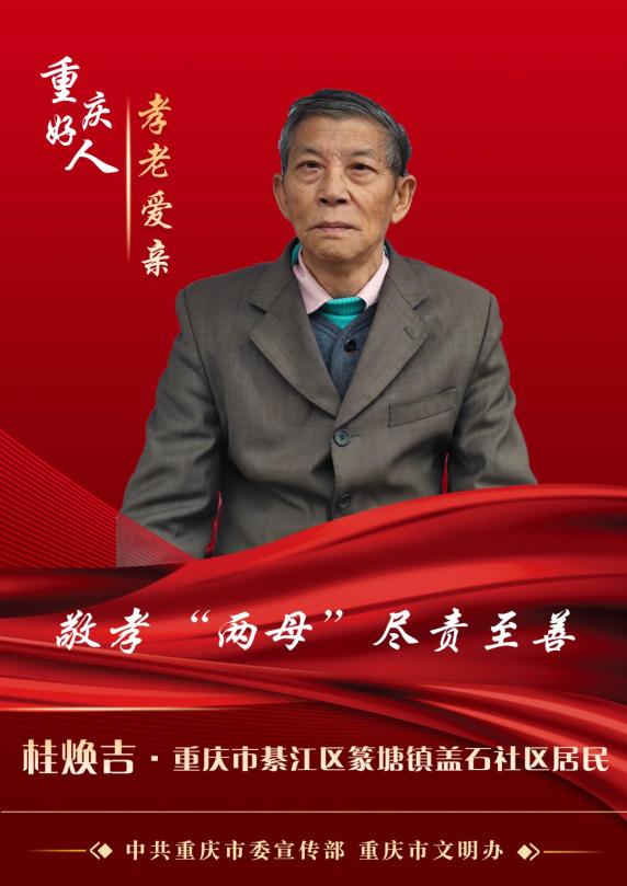 重庆市綦江区篆塘镇盖石社区居民桂焕吉,视力、肢体3级残疾,在妻子离家出走、亲生母亲与儿子相继病逝后,贴心照料岳母多年,现年94岁的岳母身体康健。