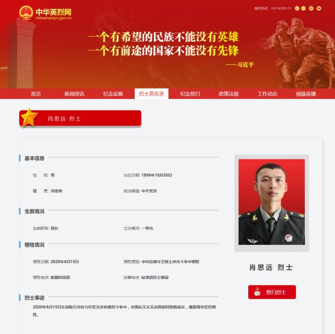 中华英烈网烈士英名录显示,戍边战士肖思远于2020年6月15日在边境冲突中誓死捍卫祖国领土,壮烈牺牲,于2021年2月被中央军委追记一等功。