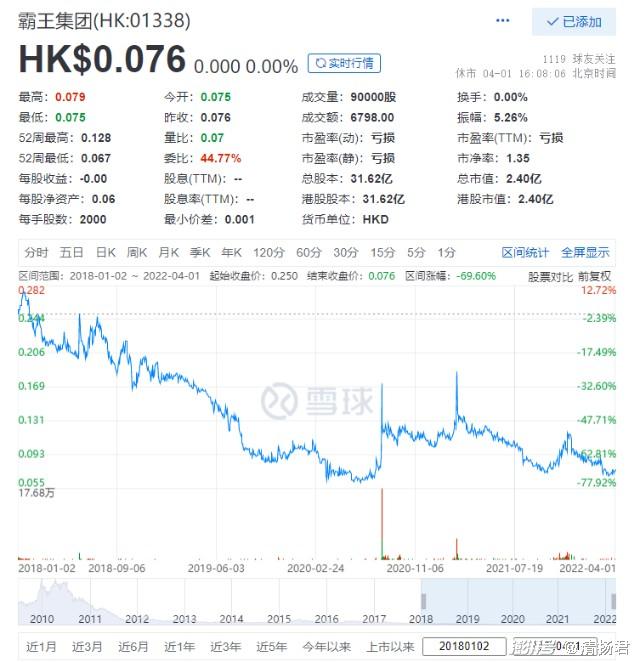 这是霸王集团连续亏损的第5年,伴随而来的是霸王集团的市值不断缩水,截止2022年4月1日收盘,霸王集团的总市值仅有2.4亿元,已成为日化行业市值最小的企业,甚至被人遗忘。