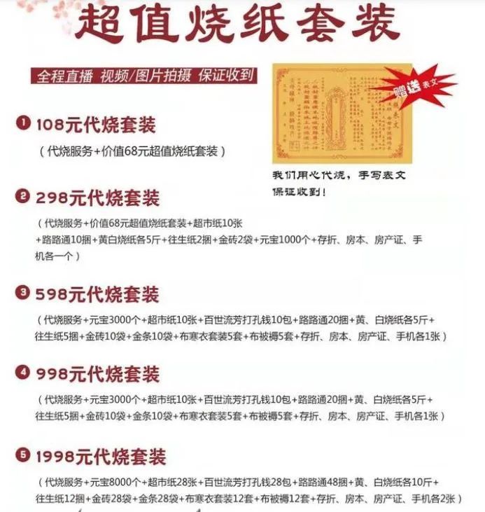 除了代客购买鲜花水果外,更有商家开动脑筋,甚至将“代烧纸”等祭祀业务也搬到网上招徕客户。据了解,一家公司推出“超值烧纸套装”,从108元至1998元共五个档位,均会手写表文,由“专业人士”用心代烧,保证亲人能够“收到”。以第四档998元的“代烧套装”为例,内含元宝、布寒衣套装、打孔钱等11种常见纸、布祭品。记者在网购平台搜索发现,这些祭品价格通常在十几二十元左右,如果走批发价则更便宜,“代烧套装”可谓利润满满。
