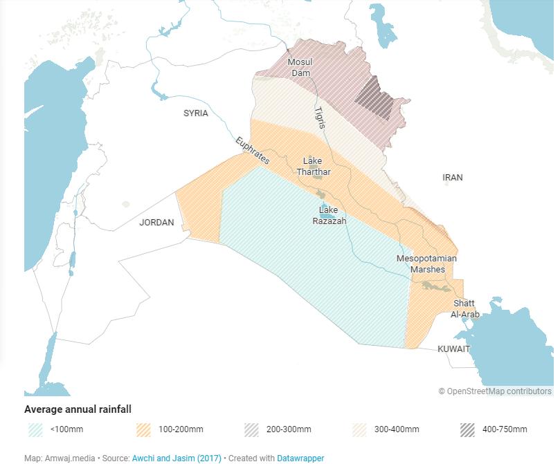 作为幼发拉底河和底格里斯河的故乡,伊拉克的降水水平极不均匀,北部的降雨量更丰富。
