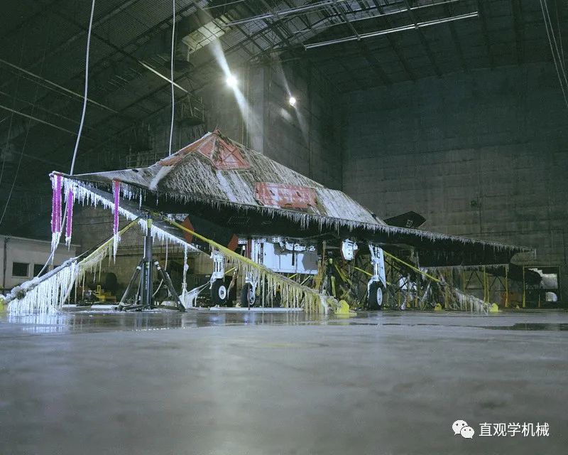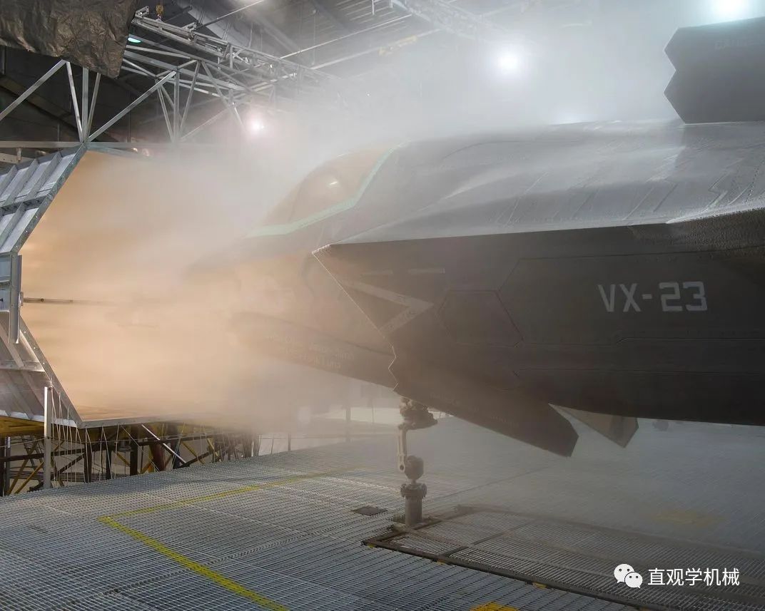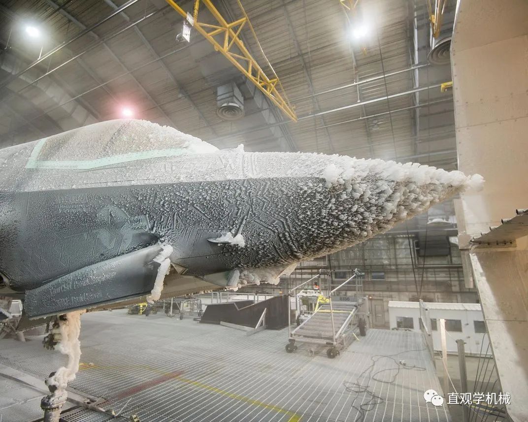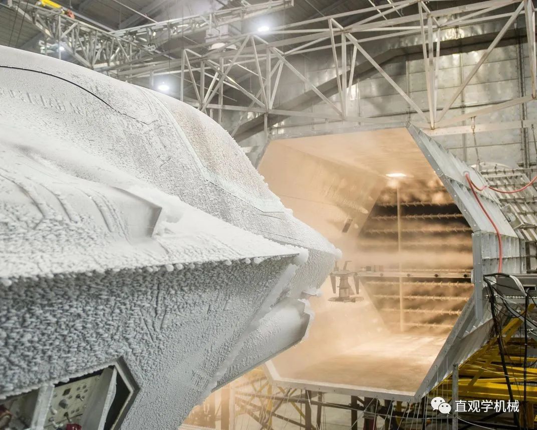 F-35B在进行结冰评价试验这些水滴喷向飞机并在接触点处凝结。尽管该实验室不能精确模拟飞机承受的风速,但是在实验舱内的独特装置能够产生高达193km/h的风速,所有水滴都会降落在F-35B飞机上。