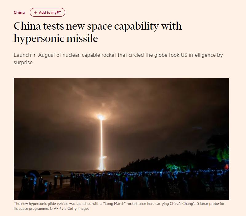 英国《金融时报》炒作中国“试射高超音速导弹”美国官员立刻跟进称,中国的高超音速技术远比美国认识到的先进。拜登也在去年10月底表示他“担忧”中国的“高超音速导弹”。