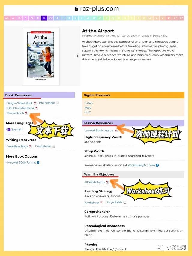 RAZ 的教师账号里,每本书后都有一套完整的 Worksheet,目的是帮助老师完成本次课的课程目标,教师账号登录内容如下: