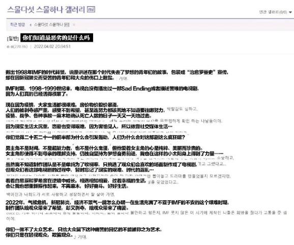 网传韩国网友评论:“搬出IMF的时代背景,说是讲述在那个时代失去梦想的青年们的故事,包装成治愈罗曼史宣传,却在因新冠肺炎而受苦的大众的伤口上撒盐。”
