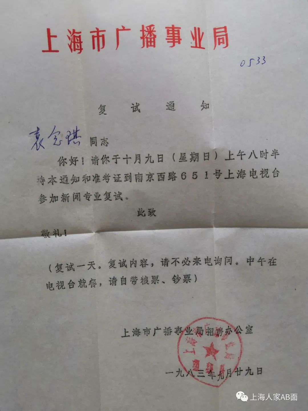 同年10月9日上午,我到南京西路651号上海电视台参加了新闻专业的复试,时间一整天。让你看一组没标题的电视新闻,然后写出标题;放一段录音,记下后,写一个新闻稿;把一则电台的新闻改写成电视新闻。那天的午饭是在电视台食堂就餐,没人买单请客,通知已关照你“请自带粮票、钞票。”菜是配好的,记得有几块带鱼。