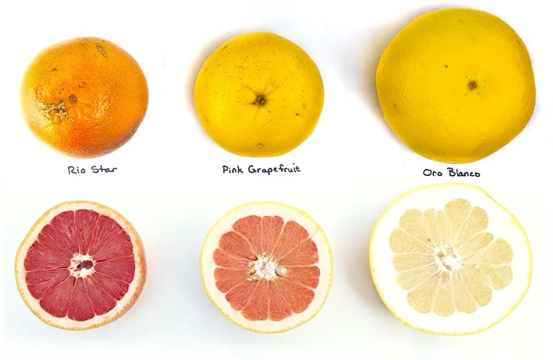 最左侧为里约星葡萄柚,和普通葡萄柚相比,果肉更红