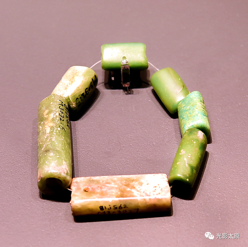璜形玉佩(左上) 绿松石串饰(左下)玉琮(中上)玉神面(中下)玉钺(右)(龙山文化时期 山西省襄汾县陶寺村出土)