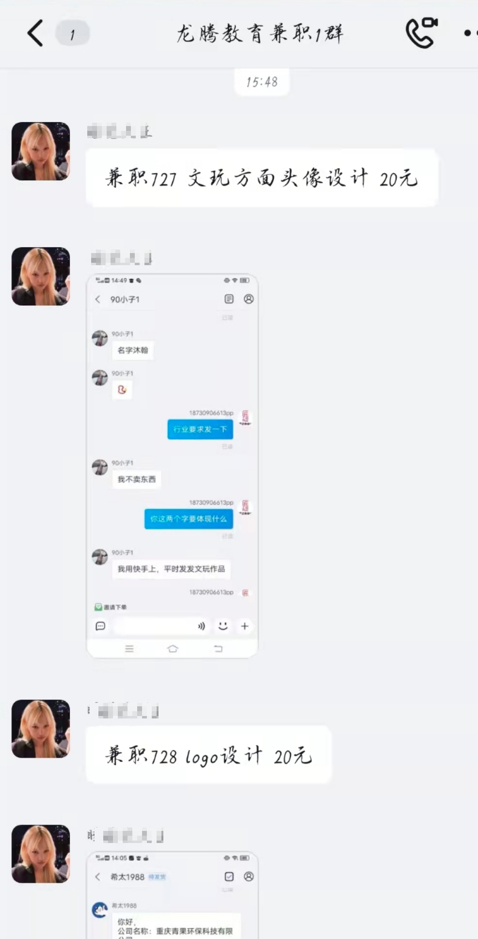 和莫丽同期报名的另一个大学生吴茜则是始终抢不到兼职单,她告诉澎湃新闻,她所在的兼职群也都是20元的logo、网页设计单。因群里禁言,抢单需私信兼职老师,但即使在对方刚发布她就私信抢单,仍然被告知已经有人接了,“我怀疑这些单子根本就不存在。”