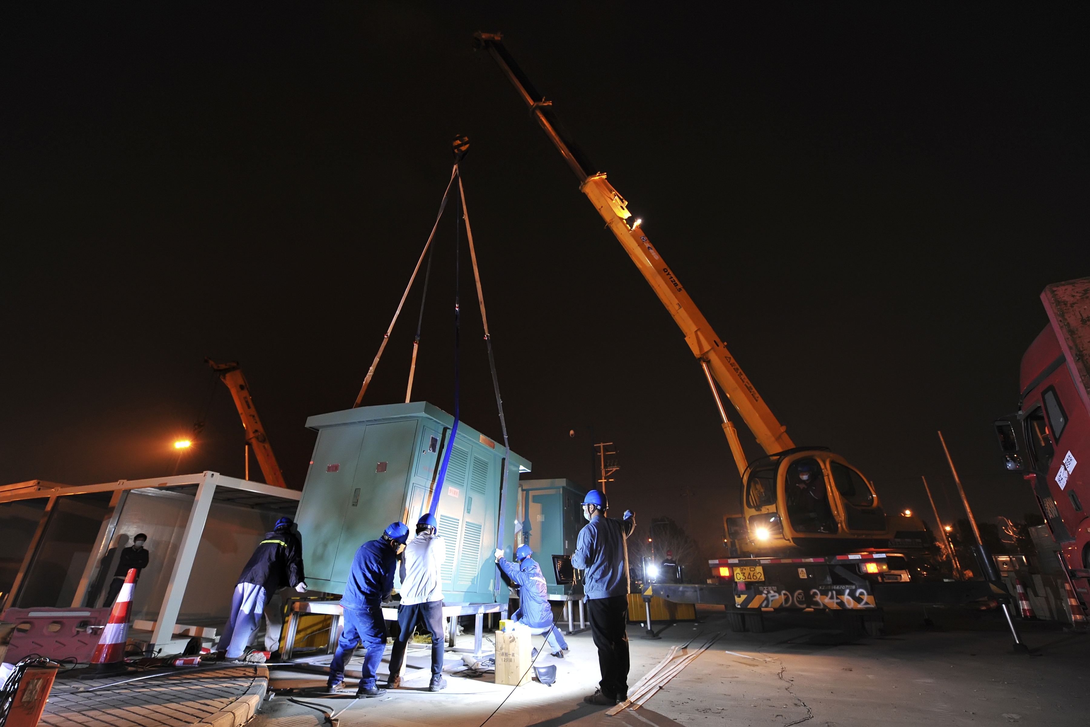 3月25日凌晨,浦东供电公司在川沙某方舱医院施工现场吊装箱变