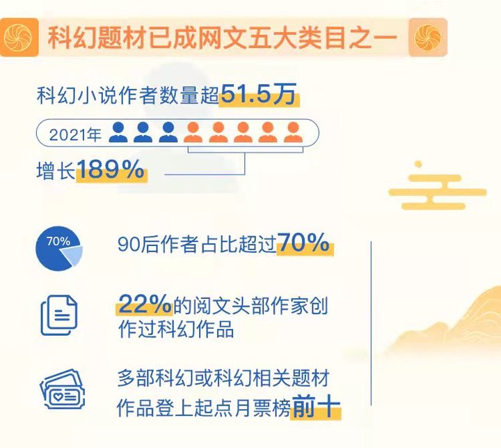 《流浪地球》爆红之后,科幻题材同样迎来爆发。“报告”中提到,在过去的5年间,仅阅文集团旗下的网站,曾经创作过科幻小说的作者数量就增长了189%,达到51.5万人次。据统计,2021年,超22%的阅文头部作家创作过科幻作品,有多部科幻或科幻相关题材的作品登上起点月票榜前十。