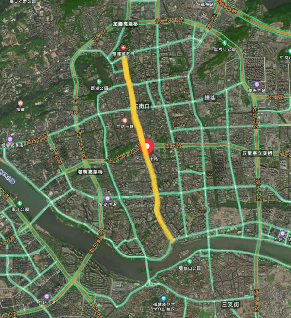 福州市区鸟瞰图,黄色部分即“八一七中轴线”