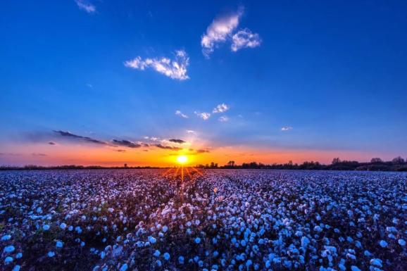 跑过稻田,远处棉花地里绽开了成片银桃子,这银桃子不是镶在绿叶上,它们全有一个个质地坚硬灰暗色的托,庄敬地把白絮团举向田地至高处。