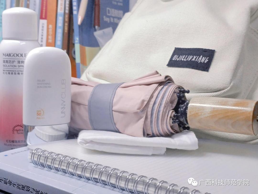 春夏交替,怕晒的同学们已经做好了万全的准备。他们的书包是遮阳伞、冰袖、防晒霜的天下,这三大“护法”,缺一不可。