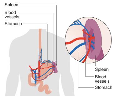 脾脏(右紫)。图片来源:wikimedia医生们拿他的病束手无策。1976年10月5日,Moore 第一次去加州大学洛杉矶分校的医学中心看病,因为他听说那里有一位白血病方面的著名肿瘤学家David W. Golde。