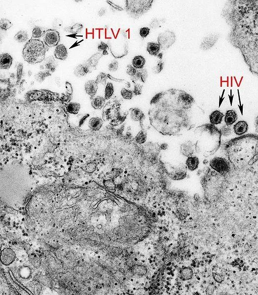 HTLV病毒(左)和HIV病毒(右)。图片来源:wikipedia在 Moore 身上发现的 HTLV 是一种新的亚型,具有重要的意义,因此研究者将他体内的病毒命名为 HTLV-II。