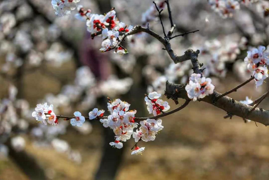©田利民杏花有变色的特点,含苞待放时,朵朵艳红,随着花瓣的伸展,色彩由浓渐渐转淡,到谢落时就成雪白一片。