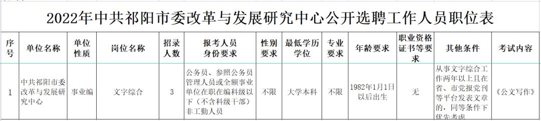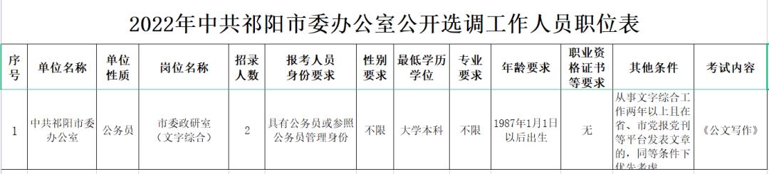 本次公开选调(聘)工作人员计划5名,其中市委办公室选调公务员身份人员2人,市委改革与发展研究中心选聘事业编制人员3人。具体职位信息见《2022年中共祁阳市委办公室公开选调工作人员职位表》(附件1)、《2022年中共祁阳市委改革与发展研究中心公开选聘工作人员职位表》(附件2)。