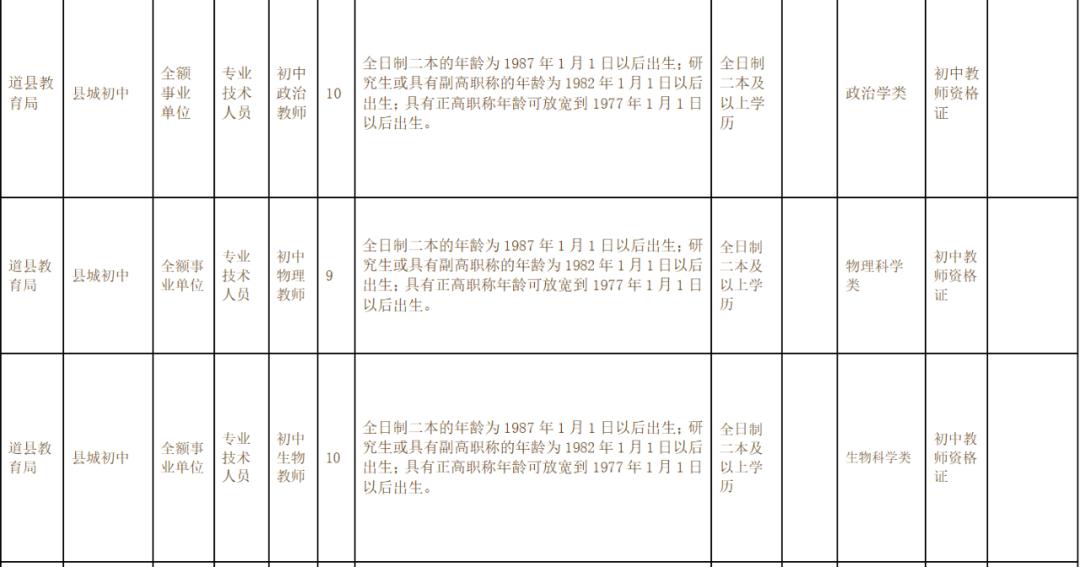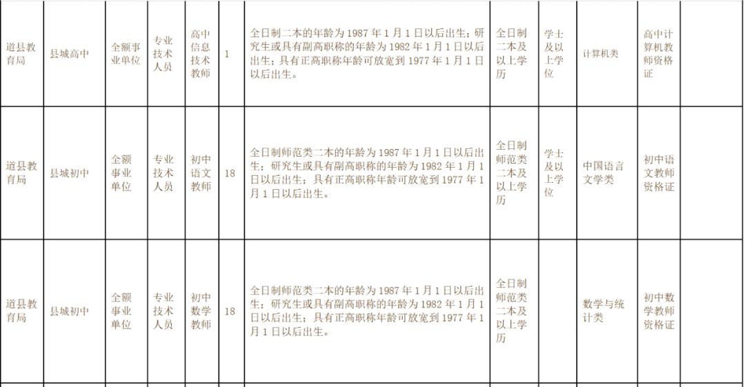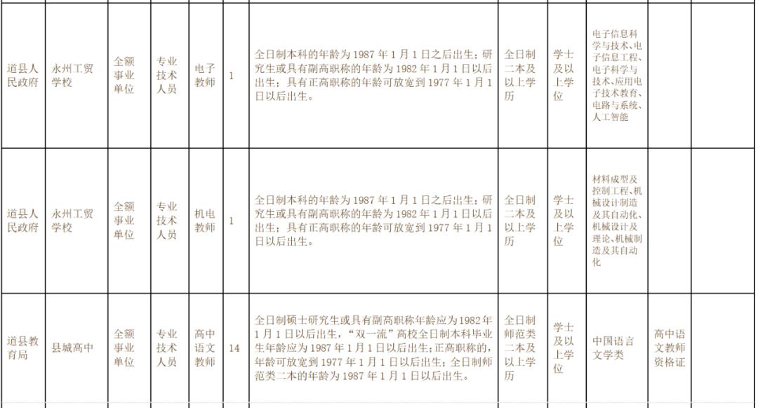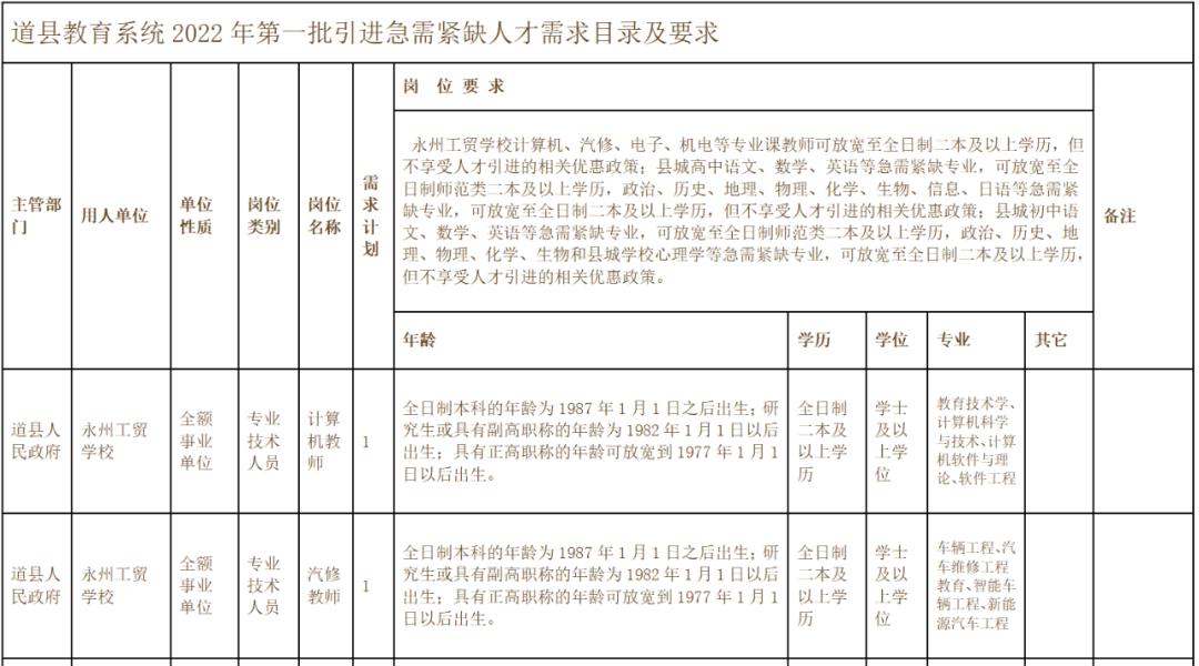 计划引进184人,其中永州工贸学校4人,县城高中教师74人,县城初中106人,职位及岗位资格条件详见《道县教育系统2022年引进急需紧缺人才需求目录及要求》(附件1)。