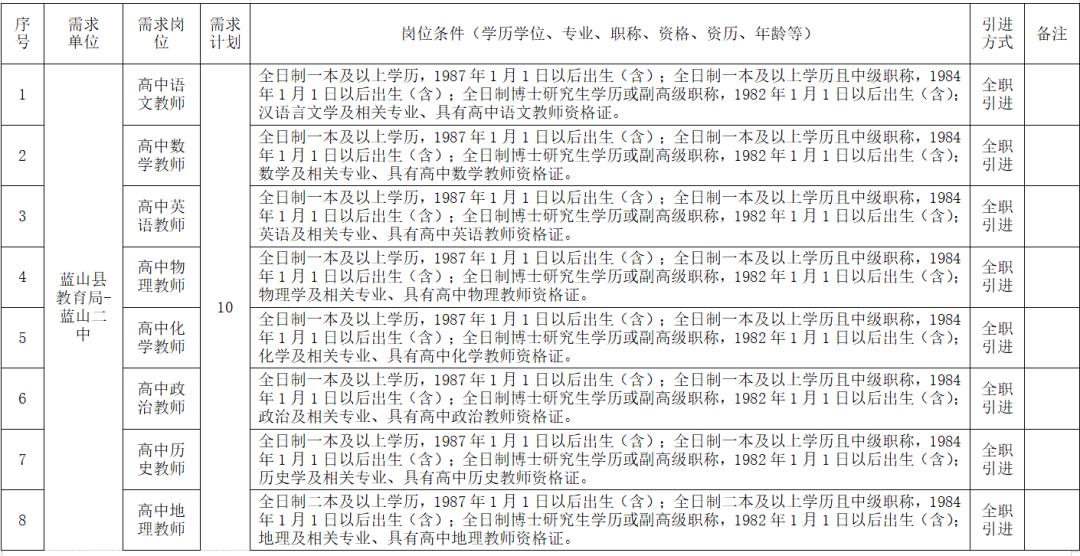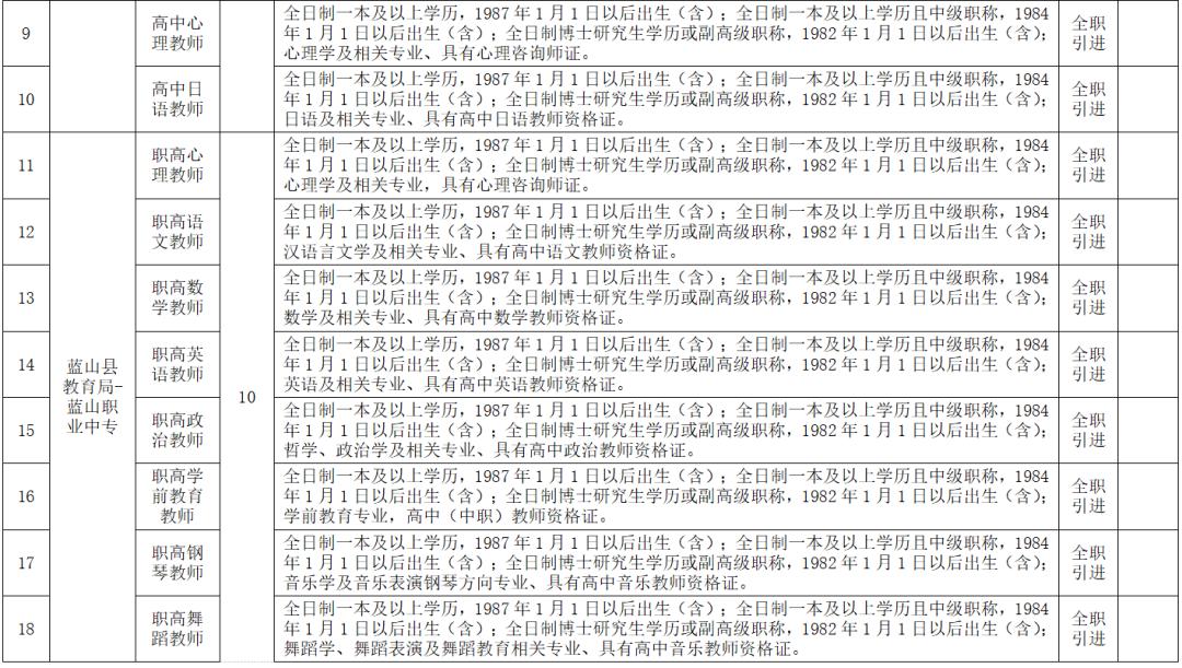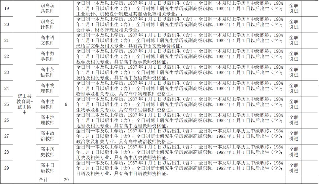 2022年计划引进教育急需紧缺人才共计29名,其中二中10名、四中9名、职业中专10名。具体岗位要求详见《蓝山县2022年引进教育急需紧缺人才(第一期)需求目录》(附件1)。