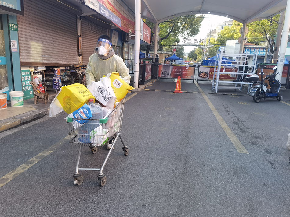 如今每天,大家排班给居民送快递,完成社区最后100米的物资递送。快递量接近于送不完的状态,我每次送完回到门口,又有新快递堆在那了。所以,居委的人也会帮我们一起送。