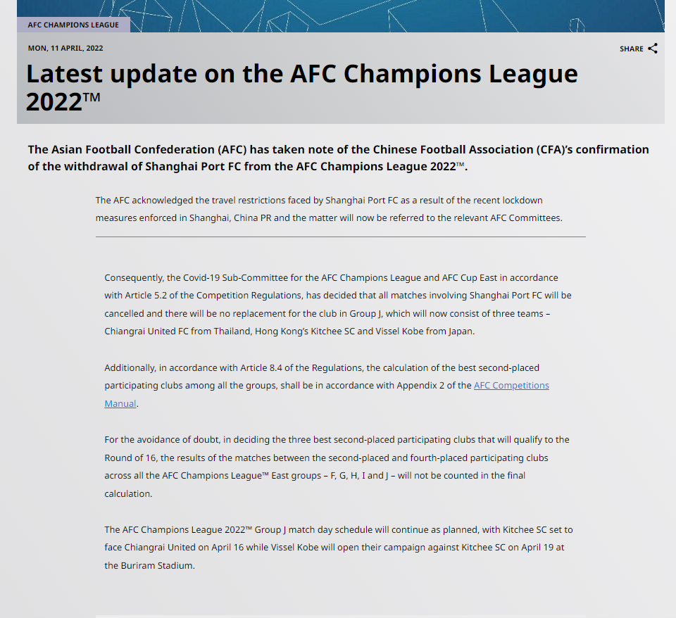 三支代表中国参加正赛的是山东泰山、上海海港和广州队。但由于近期上海疫情形势严峻,部分球员正处于隔离状态,同时球队出发和回程的行程也受到防疫的影响很难确定,在这样的情况下,海港最终还是做出了退出的决定。