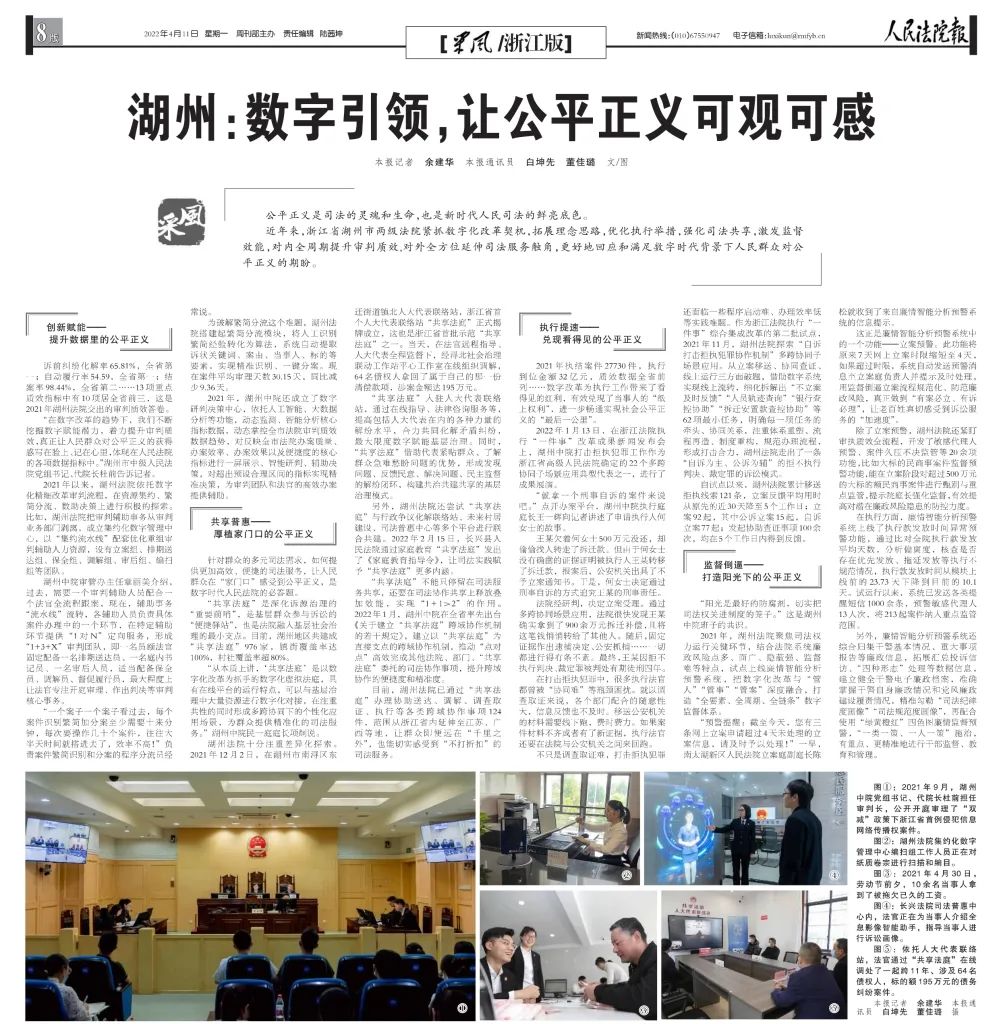 2022年4月11日,《人民法院报》第8版刊出专版文章,点赞湖州法院数字改革工作。全文如下:01