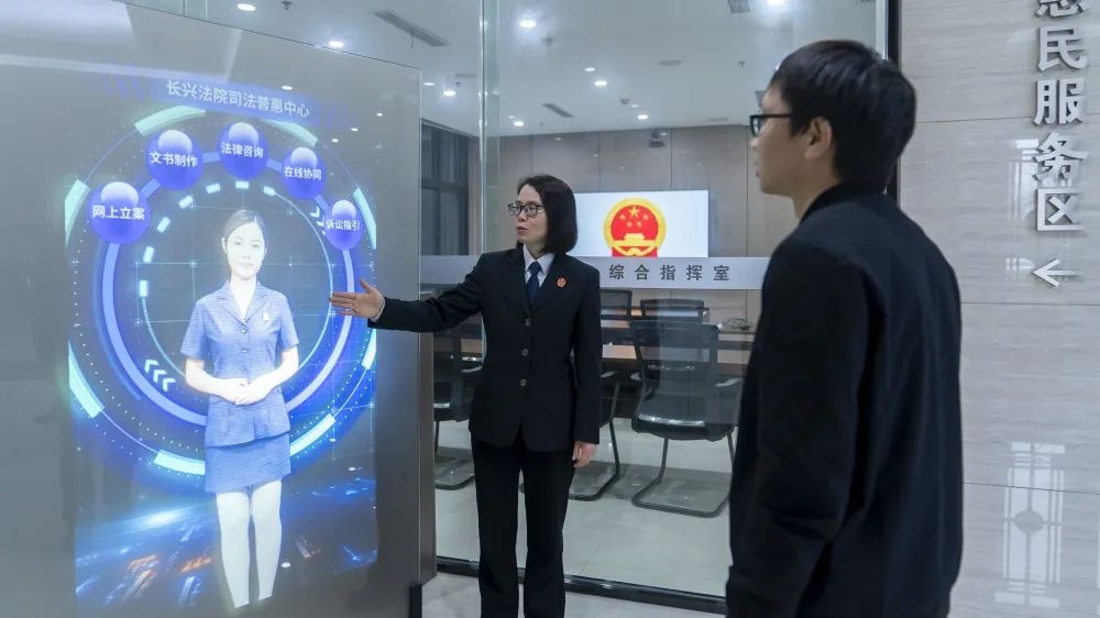 长兴法院司法普惠中心内,法官正在为当事人介绍全息影像智能助手,指导当事人进行诉讼画像“共享法庭”不能只停留在司法服务共享,还要在司法协作共享上释放叠加效能,实现“1+1>2”的作用。2022年1月,湖州中院在全省率先出台《关于建立“共享法庭”跨域协作机制的若干规定》,建立以“共享法庭”为直接支点的跨域协作机制,推动“点对点”高效完成其他法院、部门、“共享法庭”委托的司法协作事项,提升跨域协作的便捷度和精准度。