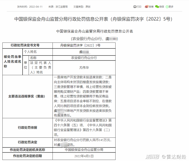 4月11日,银保监会官网公布行政处罚信息公开表,农业银行舟山分行被中国银保监会舟山监管分局罚款人民币145万元。