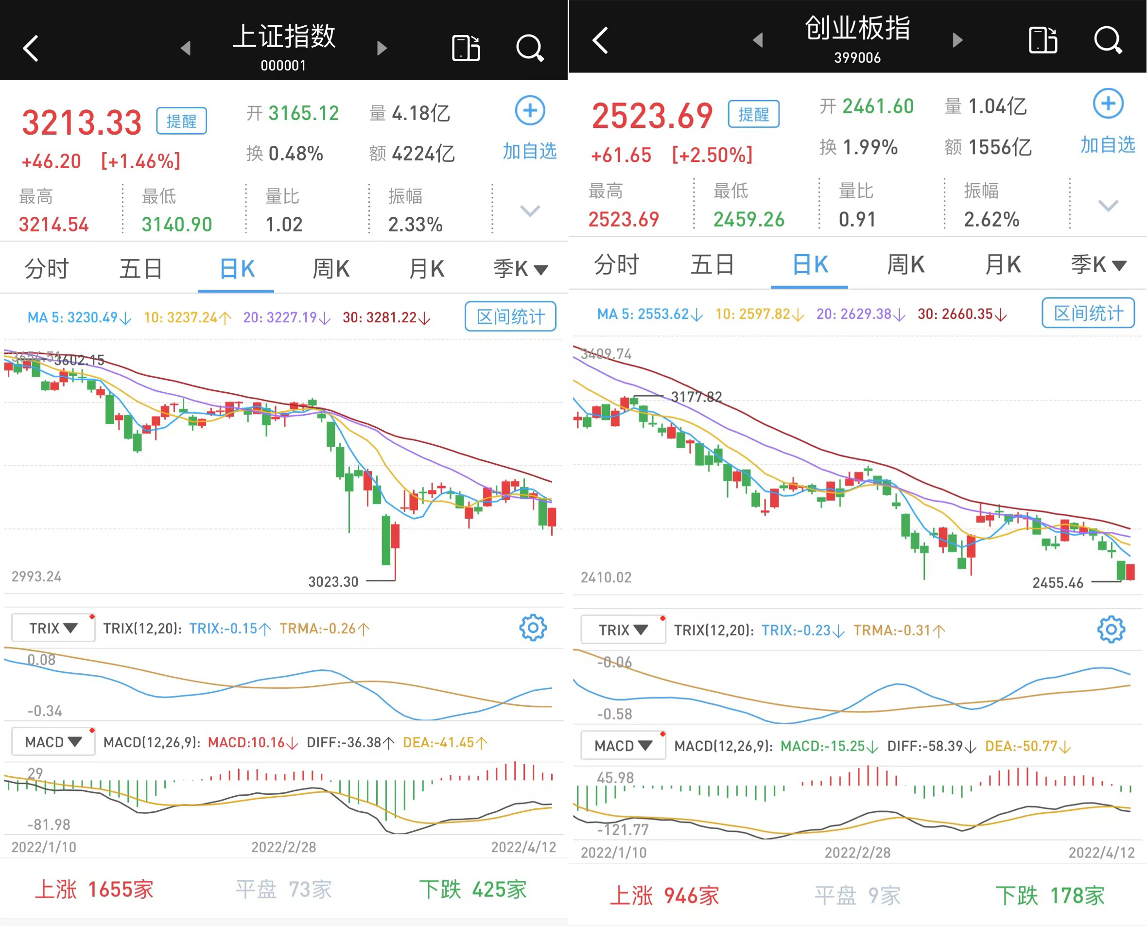 三大股指4月12日开盘涨跌互现,早盘指数分化,沪指维持弱势震荡,创指保持强势震荡。午后恢复交易后,非银金融板块出现快速上涨,带动沪深两市出现一波急涨,三大指数涨逾1%,创业板指更是涨逾2%。至4月12日收盘,上证综指涨1.46%,报3213.33点;科创50指数涨0.57%,报994.44点;深证成指涨2.05%,报11756.38点;创业板指涨2.5%,报2523.69点。