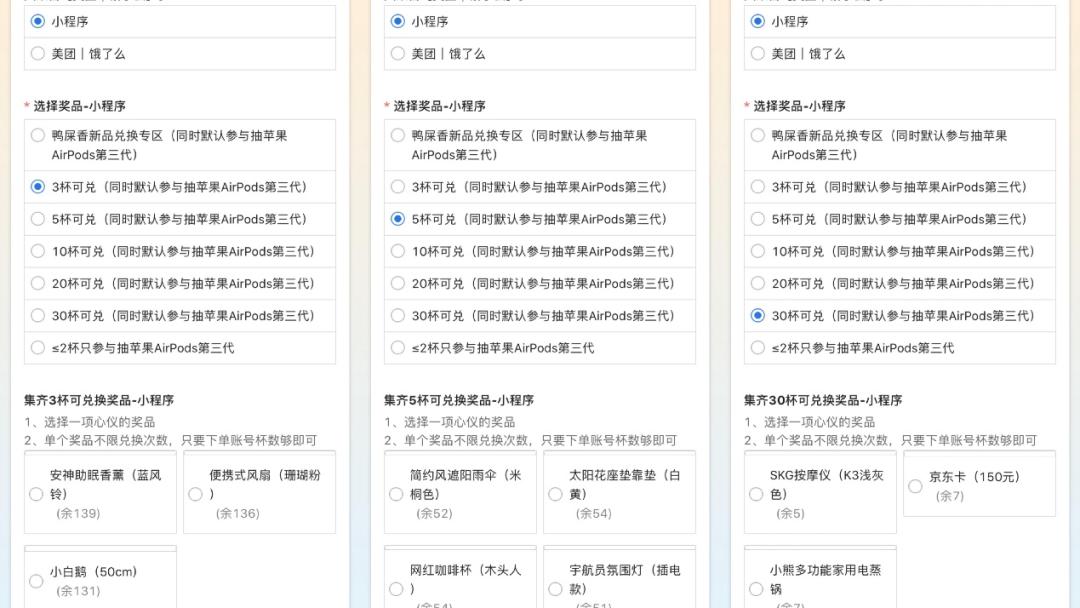 以最近的4月活动为例, 3杯可兑的奖品包括安神助眠香薰、便携式风扇和小白鹅玩偶;5杯可兑的奖品包括简约风遮阳雨伞、太阳花座垫靠垫、网红咖啡杯和宇航员氛围灯;而30杯可兑的奖品则包括SKG按摩仪、150元的京东卡和小熊多功能家用电蒸锅。至于抽奖奖品则是苹果AirPods第三代。