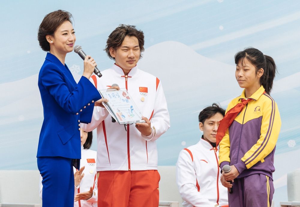 北京冬奥会冠军苏翊鸣(前中)在现场与学生互动。新华社发