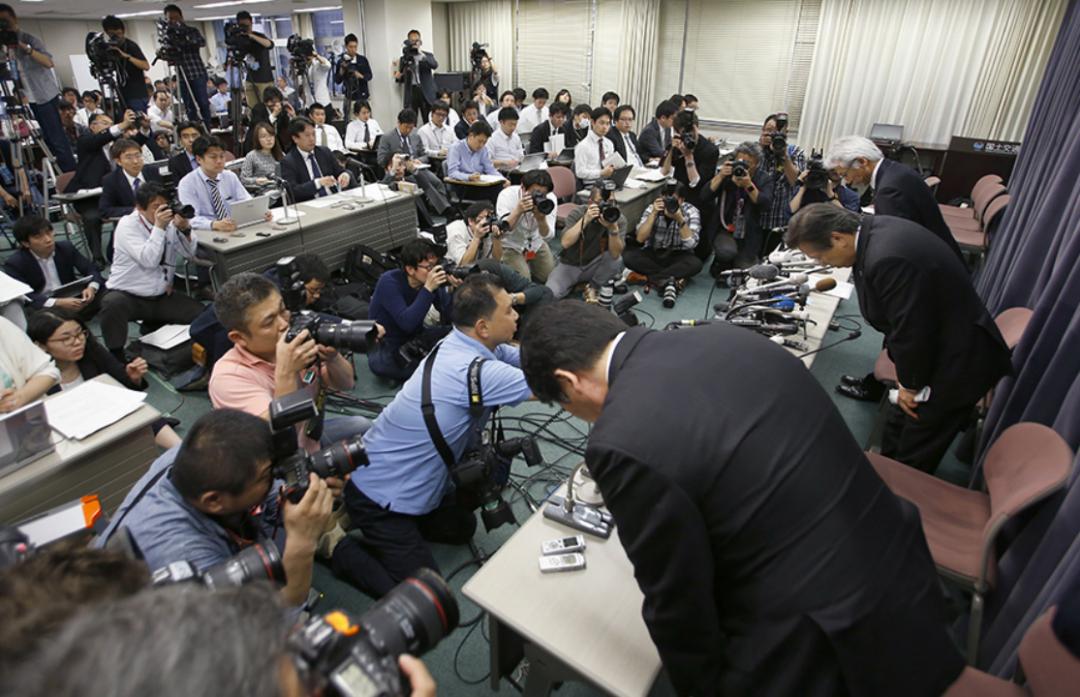 2016年4月26日,日本东京,日本三菱汽车公司社长相川哲郎(右中)出席记者会时鞠躬。2016年4月,三菱汽车被爆,为获日本环保车减税制度中最高级别免税认定,从1991年起便在油耗测试中篡改数据,使油耗降低5%-10%,测试舞弊覆盖4款、共计62.5万辆微型车。
