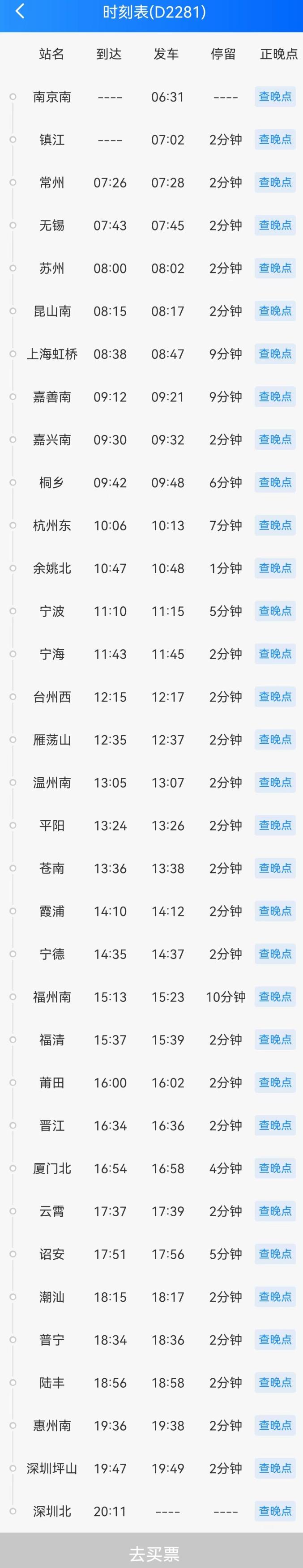 D2281次列车始终站点为南京-深圳北,全程共14小时08分,沿途经过江苏、上海、浙江、福建、广东等多省市。