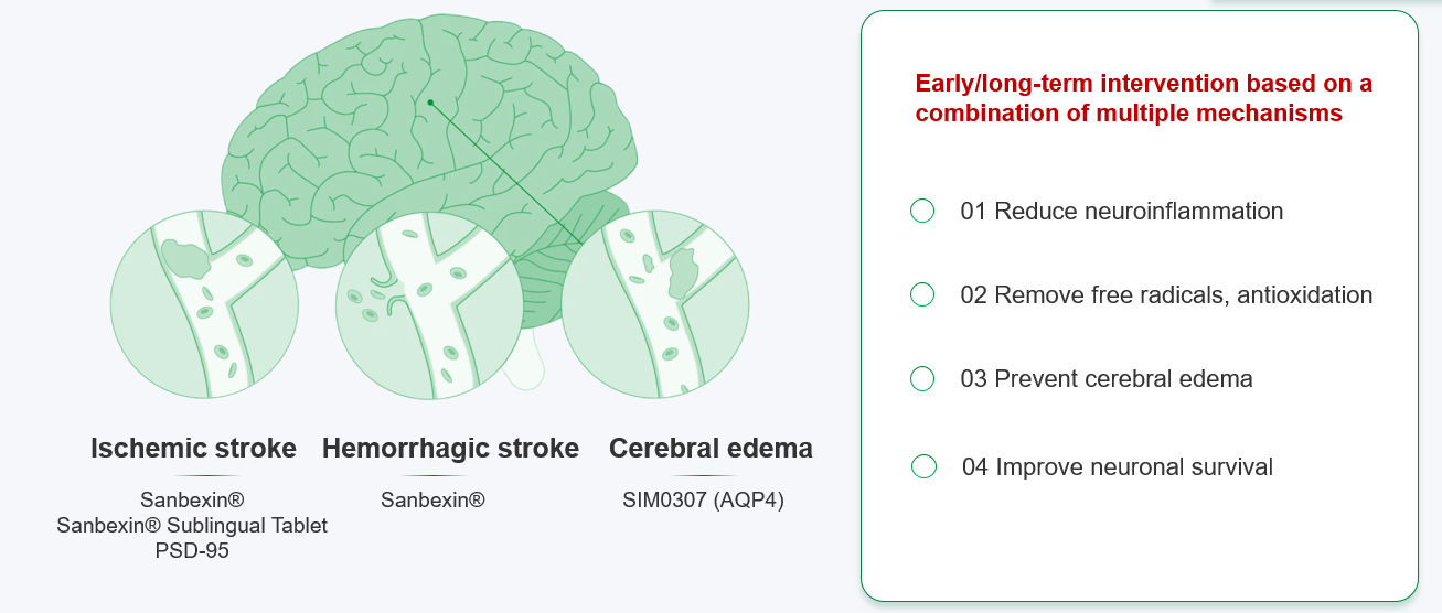 脑卒中有极高的致死率和致残率,中国每年新发330万患者,是重大临床需求领域。先声药业多年深耕脑卒中治疗领域,已形成上市药物和在研药物的多重机制纵深矩阵。