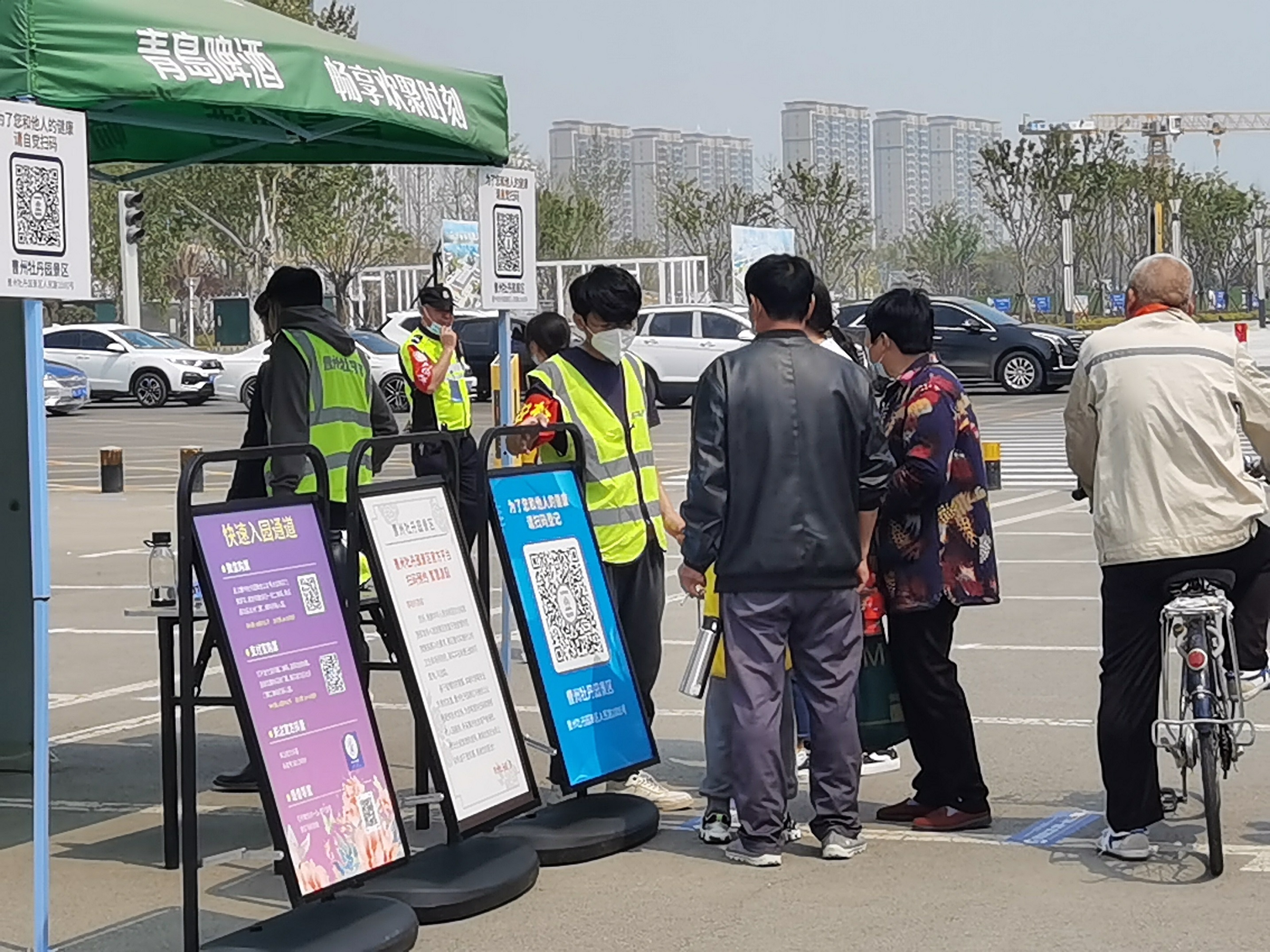 4月18日上午10点,记者来到曹州牡丹园东门入口处,只见工作人员手持测温仪,正为现场有序排队的市民、游客测量体温,接着还要逐一核对健康码、行程码等;在牡丹园内,已入园的市民自觉佩戴着口罩,保持安全距离。