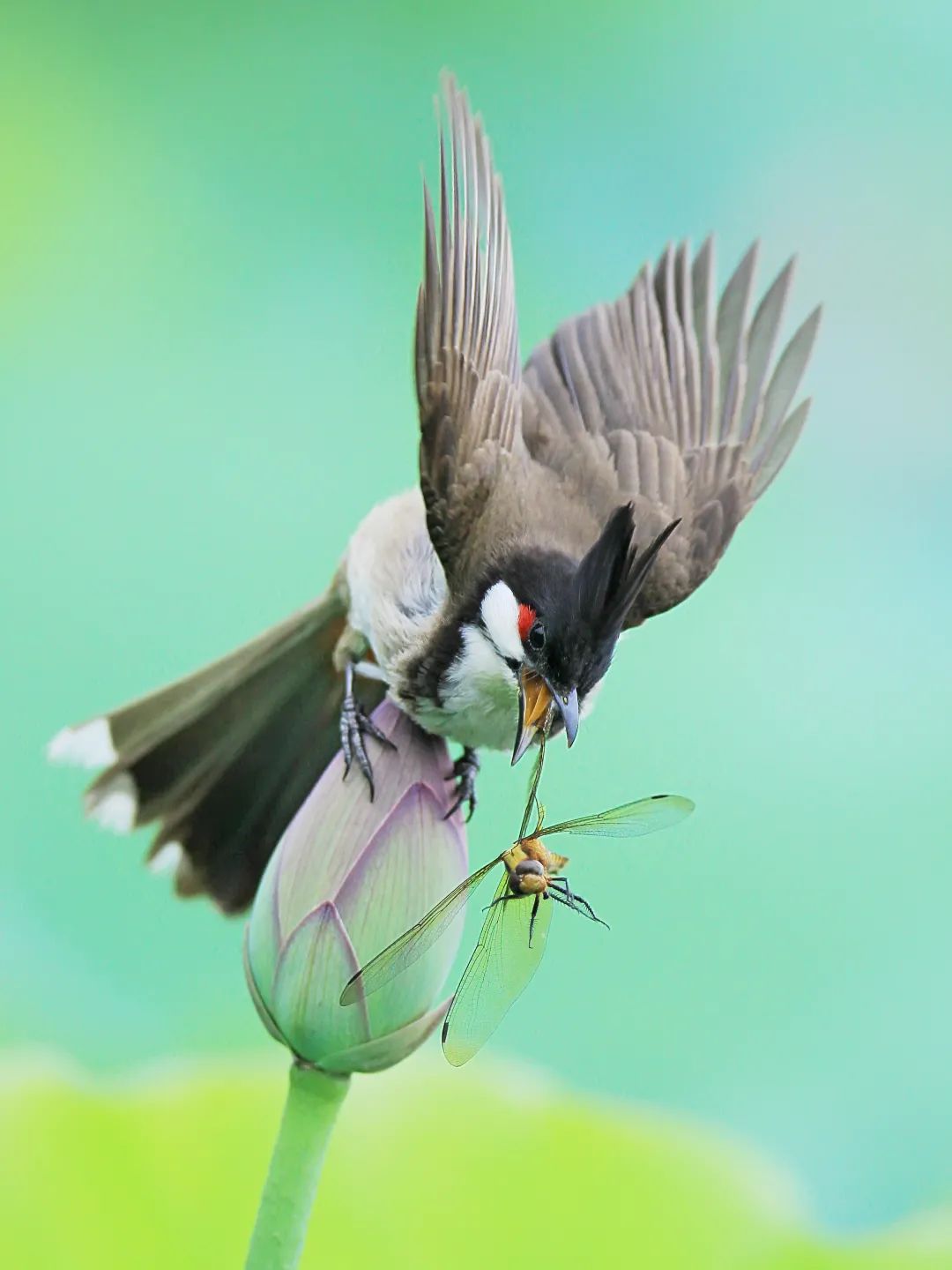▲洪湖公园,落入红耳鹎口中的黄蜻。一些鸟儿平日里荤素搭配,到了繁殖季节,会成为疯狂的肉食者。吴健晖/摄