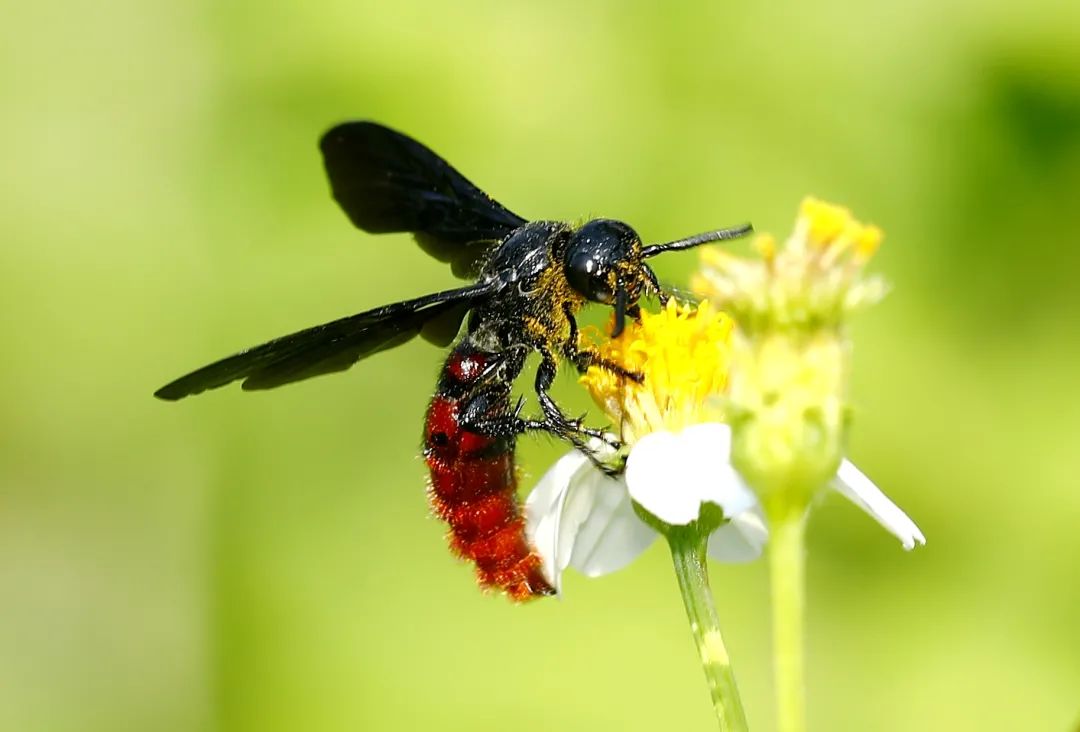 ▲阳台山上,天蓝土蜂在白花鬼针草中吸蜜。天下没有白吃的午餐,它无意中承担了传递花粉的任务。南兆旭/摄
