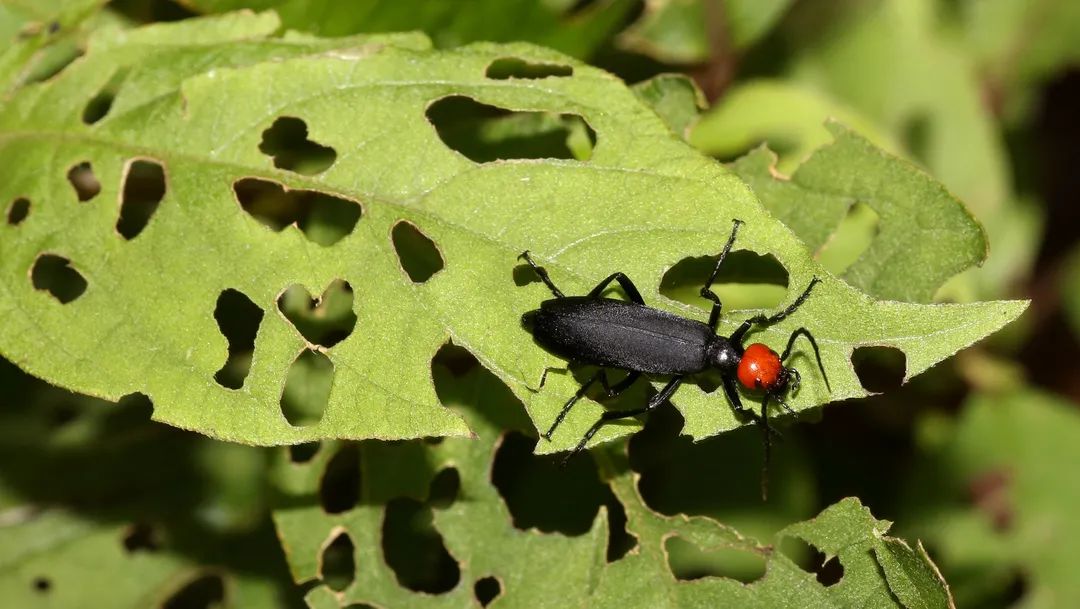 ▲七娘山的次生林里,毛胫豆芜菁嘴下的叶子千疮百孔。南兆旭/摄