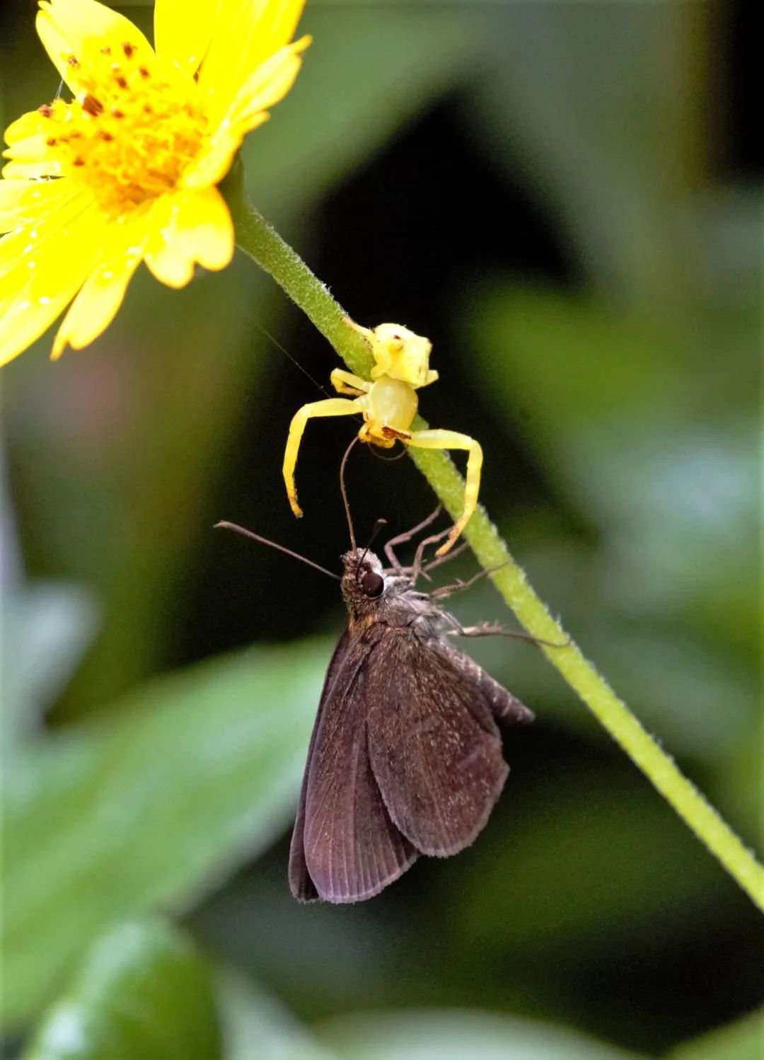 ▲斑络新妇(人面蜘蛛)正在享用体格比它壮硕许多倍的叉尾太阳鸟。一些看似柔弱娇小的动物,也隐藏着以小博大的捕食本领。金莹/摄