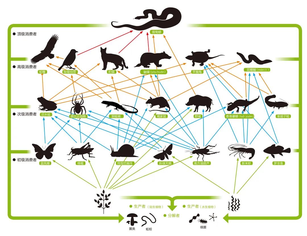 ▲深圳的食物链示意图(摘自《深圳自然博物百科》 南兆旭/著)在这张示意图里,吃与被吃的关系盘根错节:植物是最初的生产者;小型无脊椎动物——如昆虫,是初级消费者;蛙、蜘蛛是次级消费者;鸟类虽然飞得最高,却不是食物链里的最高消费者,在深圳,蟒蛇盘踞在食物链的顶端。