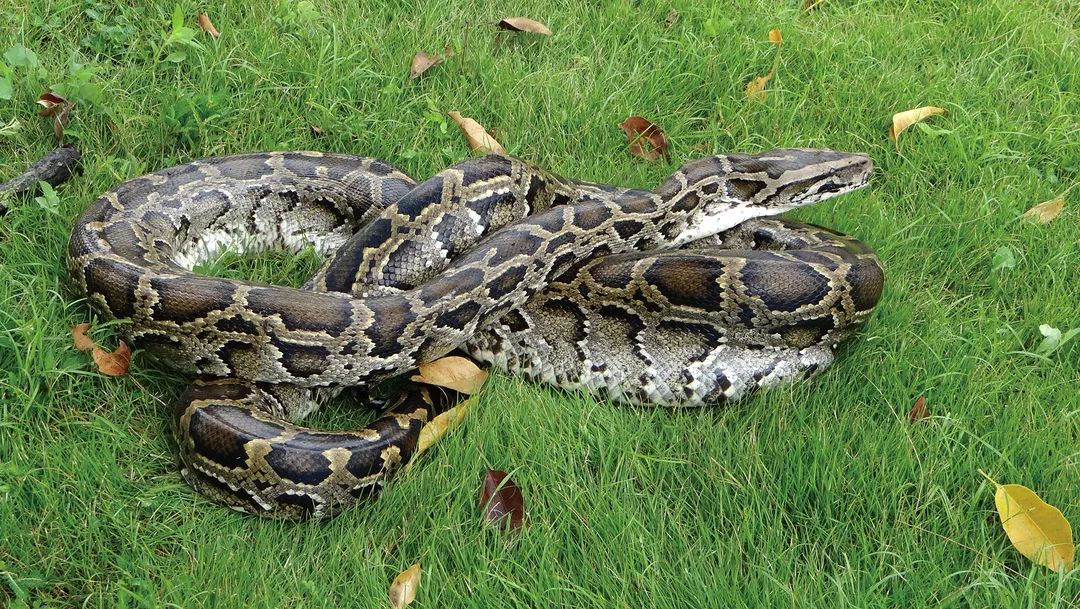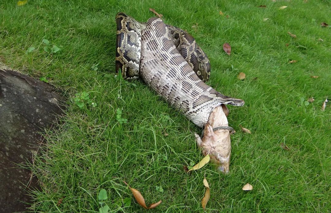 ▲内伶仃岛自然保护区里,完整地吞下了一只小羊的缅甸蟒。陈宗兴/摄