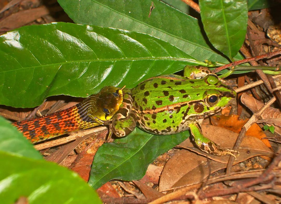 ▲梅林公园里,吞食黑斑蛙的红脖颈槽蛇。李成/摄