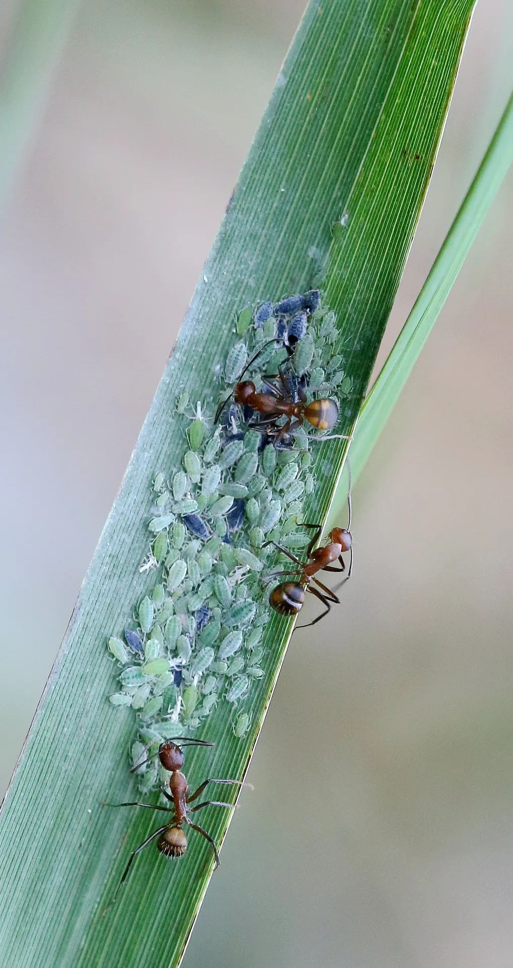 ▲“放牧”蚜虫的尼科巴弓背蚁。蚜虫吸食植物的液汁,排泄出粘稠透明的甜液——蜜露,这是蚂蚁极度喜爱的“奶汁”。蚂蚁会看守着这些蚜虫不受其它捕食者的伤害,并不时用触角刺激蚜虫的腹部,让它们持续分泌“蜜露”。南兆旭/摄