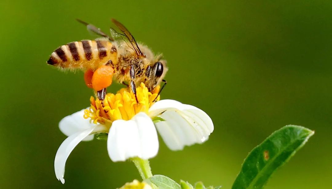 ▲采集花蜜,挂满花粉的东方蜜蜂。工蜂有一对膨大的后足,上面长着许多刚毛,是沾附存放花粉的“花粉篮”。南兆旭/摄